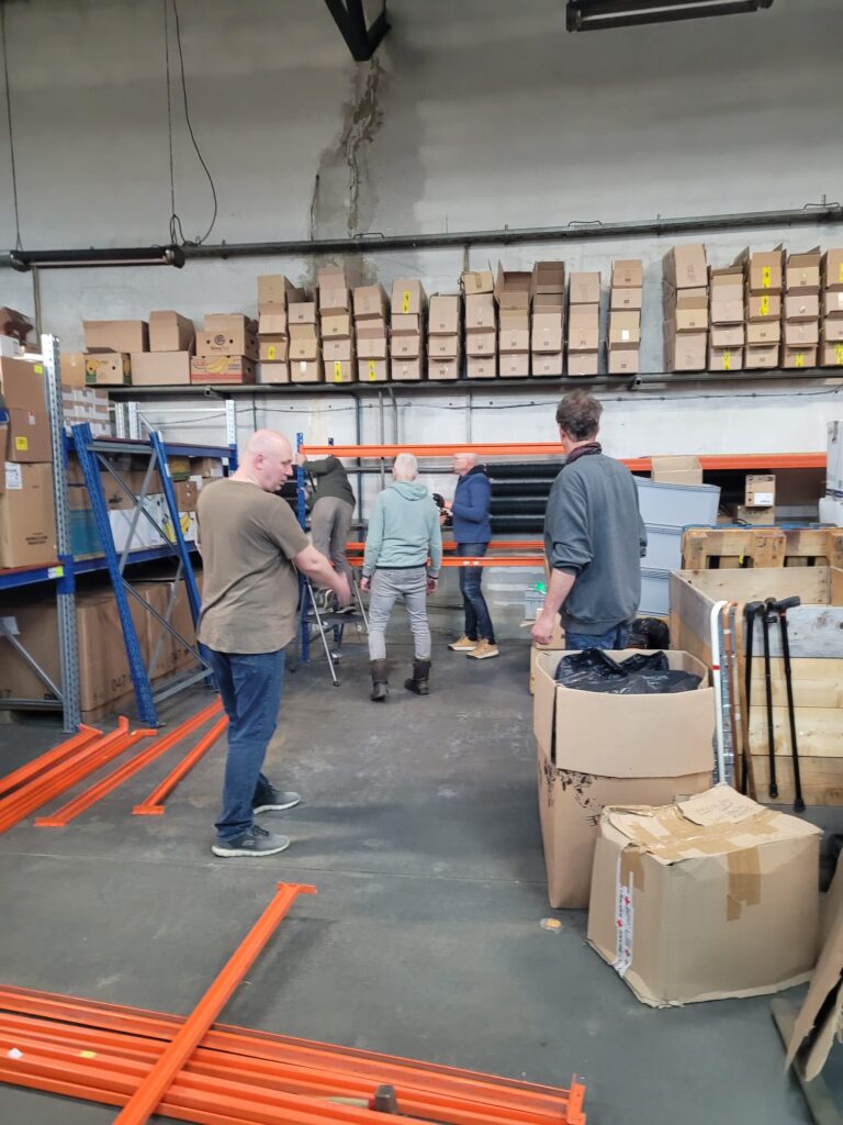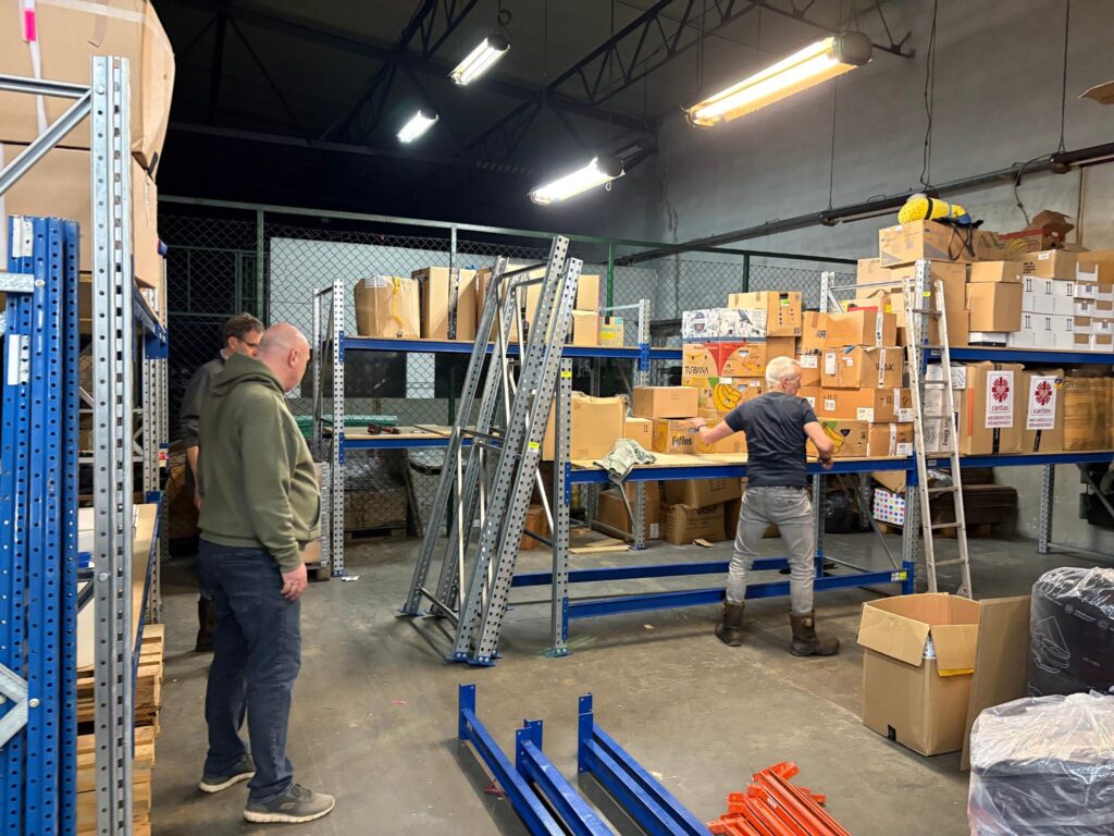 This trip we travelled together with a group from the church De Fontein, and they also brought many shelving units. We set these up at Team Krakow, which helps them enormously with sorting and storing everything that comes in and goes out again. We also helped load one of the transports, and I find it wonderful to see that items we collected from church members in Nijkerk on Tuesday are already on their way to Ukraine!