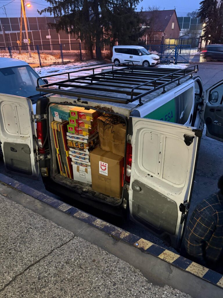 We almost always take one or more bales of newly purchased underwear and socks with us, and this time there were also two boxes of thermal socks. These were immediately sent on transport for the soldiers. We heard that they are extremely important right now — the scenes in the trenches resemble those of the First World War… it is so cold that toes are freezing and have to be amputated. So if you would like to buy something to support our work, thermal socks are very welcome. Marieke and Aalt will take them with us on our next trip in two weeks.